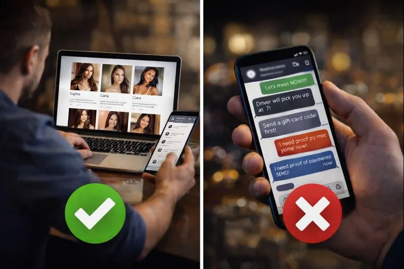 Confirme: horário, duração, ponto de encontro, expectativas e preferência de privacidade. Você não precisa se explicar demais; precisa ser preciso.